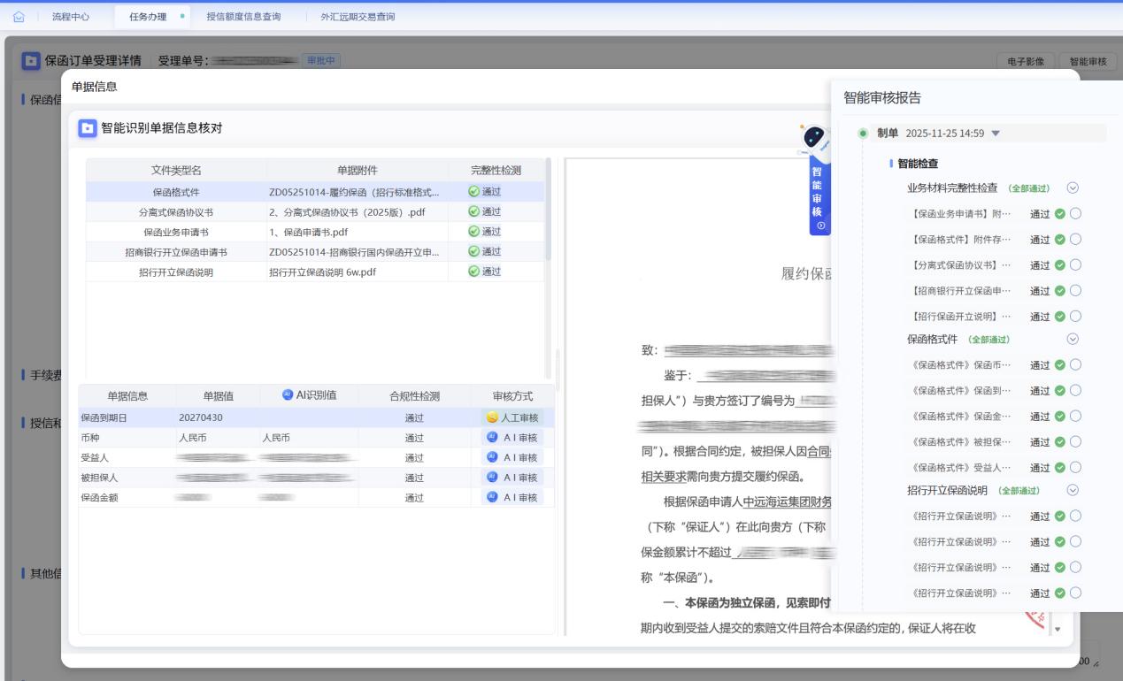 此次上线的智能辅助审核功能,主要依托先进的AI大模型技术,实现了两大核心突破:一是自动化处理重复性审核工作,在财务公司收到保函受理流程后,系统可快速完成基础材料完整性核验、填单信息准确性校验等标准化审核环节,生成清晰的AI审核结果,经办人员仅需聚焦重点内容开展针对性复核,后续各审核节点可实时查看每一项审核要点的核验详情,以自动化手段提升审核流转效率,让人力从重复性劳动中解放,聚焦高价值专业判断;二是构建标准化审核规则库,以监管法规要求与公司业务政策为核心依据,涵盖材料核验、合规审查等全流程核心要点,确保审核工作有章可循、标准统一,实现风险点可视化呈现,从源头降低操作风险与合规风险。